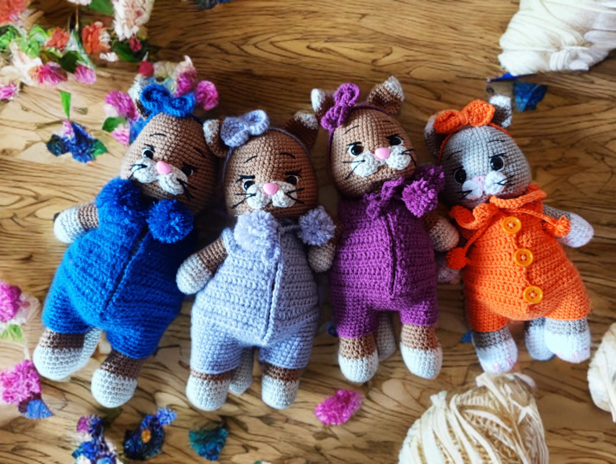 Aspect: Accesorii detaliate precum fundița decorativă și salopeta croșetată, plus un nas roz din plastic și mustăți brodate manual.