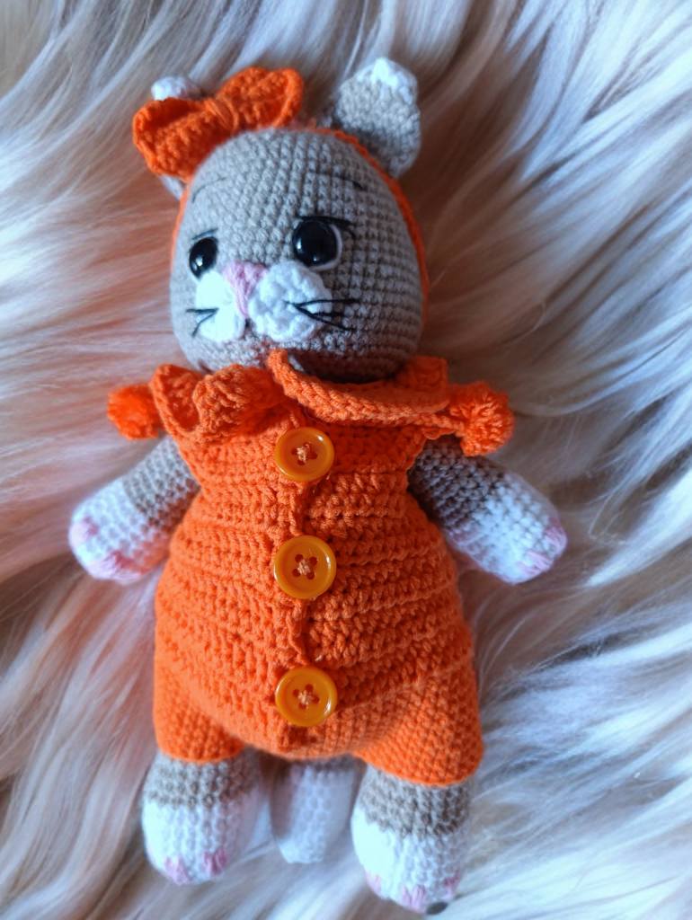 Această pisicuță amigurumi croșetată aduce veselie și siguranță oricărei camere de copil, fiind creată cu grijă din materiale prietenoase cu pielea și cu atenție pentru fiecare detaliu.